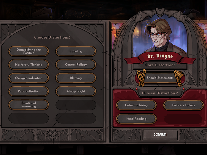 Efter en tilpas pædagogisk gennemgang af den første håndfuld forvrængninger, bliver man kastet ud i sin første enetime med en patient. Samuel er intimideret ved det hurtige fremskridt fra teori til praksis, men det er der absolut ingen grund til. Han, og spilleren, bliver nemlig holdt i hånden hele vejen af den erfarne Andromachos. Ind flyver en vampyr med problemer af den ene eller den anden art. Man lytter til dem fortælle, hvad der ligger dem på sinde, og Samuel svarer i forudbestemte vendinger. Meningen er, at dette skal give kontekst til patientens sindstilstand og velsagtens agere underholdning. Det er bare ikke særlig underholdende. Der er morsomme momenter, ja, men de er for sjældne til at give blod på tanden, hvad historien angår. Stemmeskuespillet er overbevisende og levende leveret af alle karakterer man møder, men med så begrænset et manuskript er der ikke meget for de udmærkede skuespillere at arbejde med.